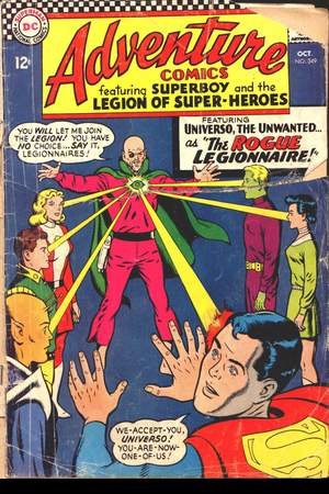 Characters: Universo, Brainiac 5, Chameleon Boy, Colossal Boy, Saturn Girl, Shrinking Violet, Superboy, Rond Vidar, Professor Huxton, Napoleon, Kublai Khan