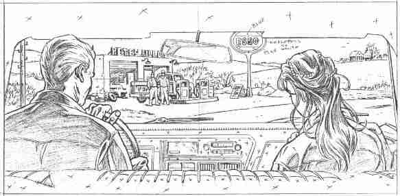 is leaning forward a bit, now looking at gas station guys, who are looking